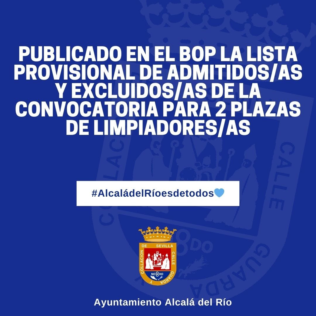 El Ayuntamiento de Alcalá del Río informa a la ciudadanía que hoy se ha publicado en el Boletín Oficial de la Provincia (BOP) la lista provisional de admitidos/as y excluidos/as correspondiente a la convocatoria para cubrir las 2 plazas de limpiadores/as.