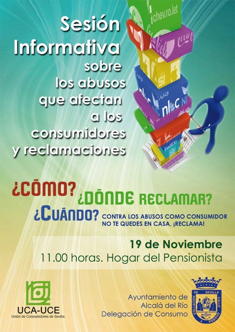 Gracias al convenio de colaboración de la Delegación de Consumo y la Unión de Consumidores, el próximo día 19 de noviembre sobre las once de la mañana en el Hogar del Pensionista se ha organizado una sesión informativa para los mayores y la población en general donde se dará conocimiento a los asistentes sobe los abusos que sufren los consumidores y procedimientos de cómo reclamar sus derechos.