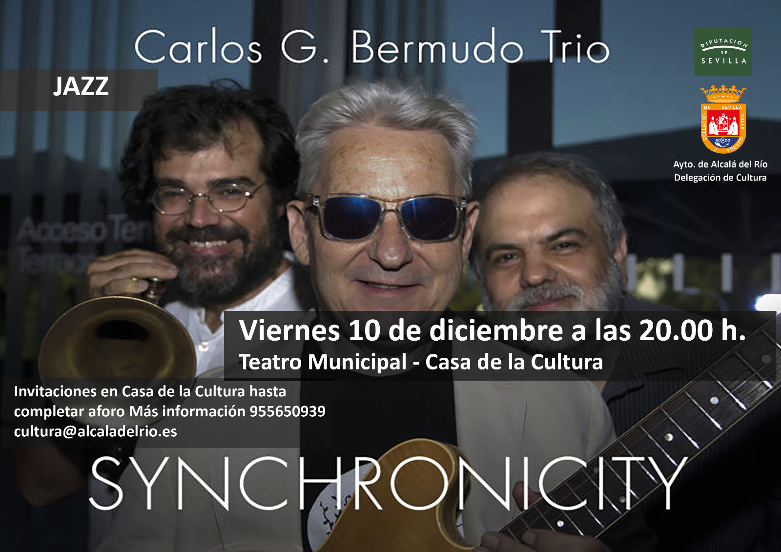 Viernes 10 de diciembre a la 20.00 h. Concierto de Jazz a cargo de “Carlos G. Bermudo Trio” con un espectáculo titulado Synchronicity. Recogida de invitaciones en Casa de la Cultura.