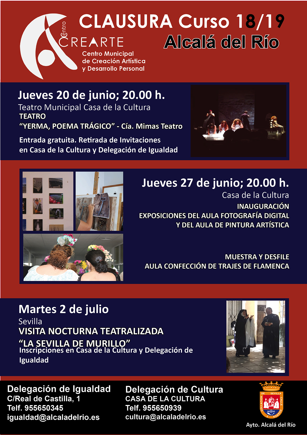 Diferentes actividades pondrán el broche de oro a las diferentes aulas formativas del Centro Municipal de Creación Artística y Desarrollo Personal 2018/19. Un centro que ya se ha convertido en referencia y que cada año pone a disposición de una amplia oferta de disciplinas como fotografía, pintura, confección de trajes de flamenca, yoga, gimnasia, etc. Todo ello enriquecido más si cabe, por las numerosas actividades culturales complementarias como las visitas culturales y teatro, entre otros.