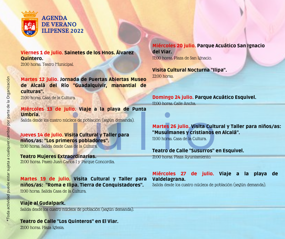 La Agenda de Verano Ilipense incluye actividades como el tradicional cine de verano y los viajes a la playa que se vienen realizando en los últimos años. Además se suman las visitas culturales orientadas a niños/as y adultos, los parques acuáticos en las pedanías y teatro de calle en los cuatro núcleos de población. También, a este programa, añadimos las fiestas patronales de los cuatro núcleos de población que comenzarón el pasado mes de junio con el inicio de la Feria de El Viar y que finalizarán en septiembre con la Feria de Alcalá del Río.