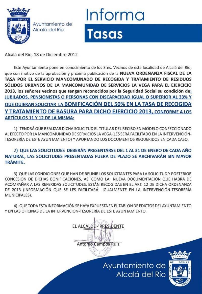 Este Ayuntamiento pone en conocimiento de los Sres. Vecinos de esta localidad de Alcalá del Río, que con motivo de la aprobación y próxima publicación de la NUEVA ORDENANZA FISCAL DE LA TASA POR EL SERVICIO MANCOMUNADO DE RECOGIDA Y TRATAMIENTO DE RESIDUOS SÓLIDOS URBANOS DE LA MANCOMUNIDAD DE SERVICIOS LA VEGA PARA EL EJERCICIO 2013, los señores vecinos que tengan reconocidos por la Seguridad Social su condición de: JUBILADOS, PENSIONISTAS O PERSONAS CON DISCAPACIDAD IGUAL O SUPERIOR AL 33% Y QUE QUIERAN SOLICITAR LA BONIFICACIÓN DEL 50% EN LA TASA DE RECOGIDA Y TRATAMIENTO DE BASURA PARA DICHO EJERCICIO 2013, CONFORME A LOS ARTÍCULOS 11 Y 12 DE LA MISMA: