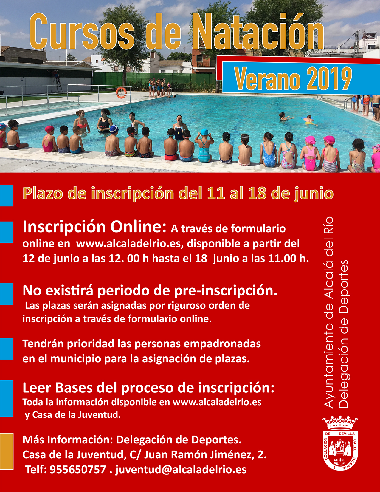 Atendiendo a problema informático ajeno a nosotros con la web municipal www.alcaladelrio.es alojada en Diputación de Sevilla, y sobre todo, para garantizar la igualdad de oportunidades en la inscripción en los Cursos de Natación 2019, TRASLADAMOS LA APERTURA DE LA INSCRIPCIÓN A MAÑANA MIÉRCOLES, 12 DE JUNIO, A LAS 12.OO HORAS , manteniéndose todo con el mismo proceso y de igual manera.