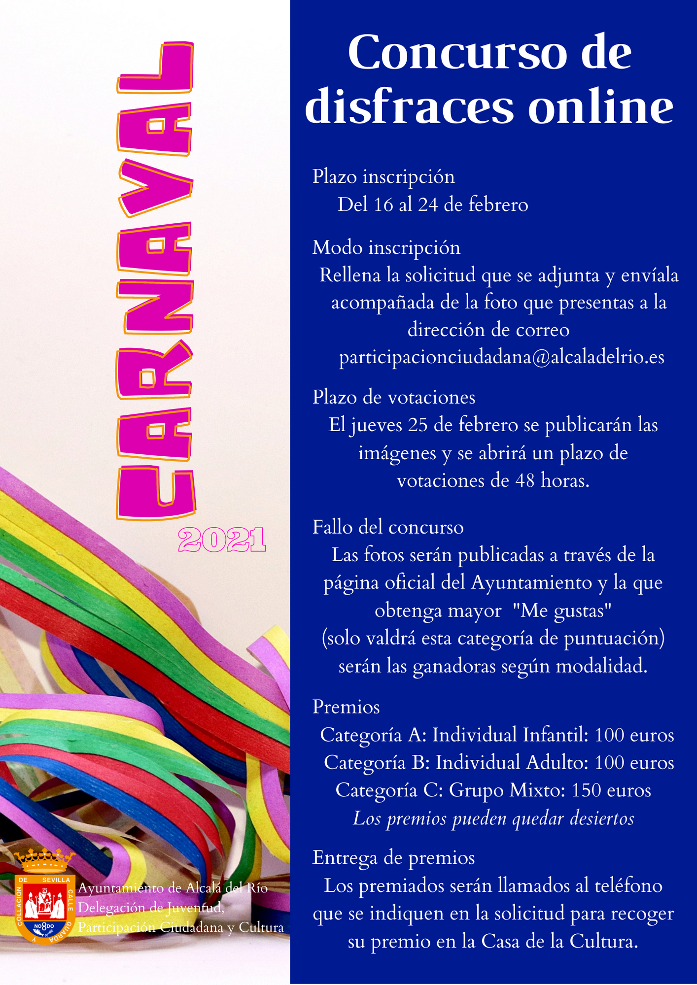 No obstante, las Delegaciones de Juventud, Participación Ciudadana y Cultura no quieren dejar pasar estos días renunciando a estas fiestas, por ello propone la celebración de un Concurso de disfraces del carnaval de Alcalá del Río 2.021 en la modalidad ON LINE.