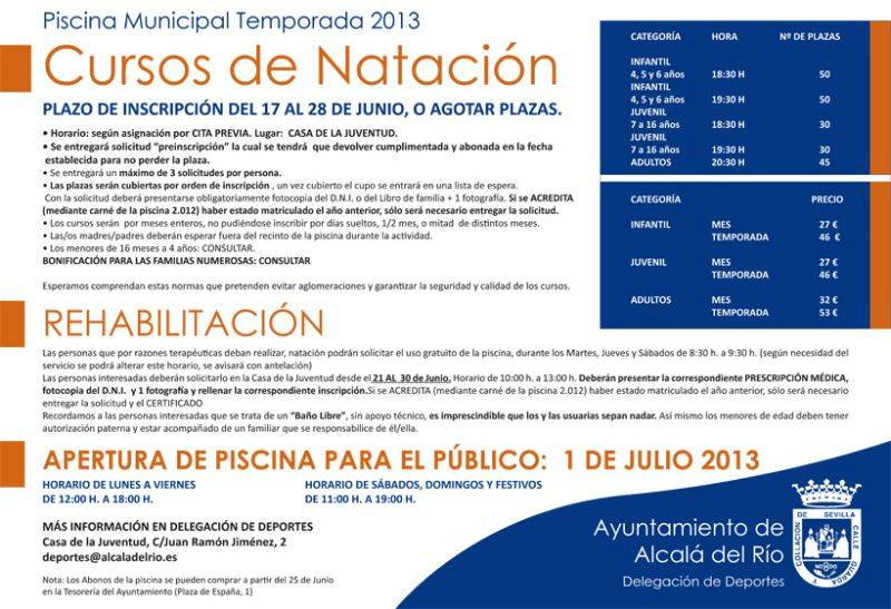 La Delegación de Deportes se encuentra de lleno trabajando en los Cursos de Natación 2013, para que todo se desarrolle con la mayor normalidad y de alguna manera se pueda atender a la mayor demanda posible. Para ello, tras las preinscripciones en la nueva plataforma de CITA PREVIA, se informan de las cursos y horarios para este verano 2013.