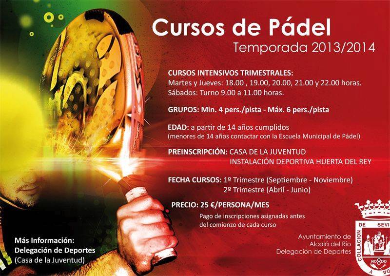 La Delegación de Deportes anuncia los cursos intensivos de pádel para la temporada 2013/2014. Se encuentra abierto el plazo de inscripción (hasta completar plazas) en Casa de la Juventud y/o Instalación deportiva Huerta del Rey.