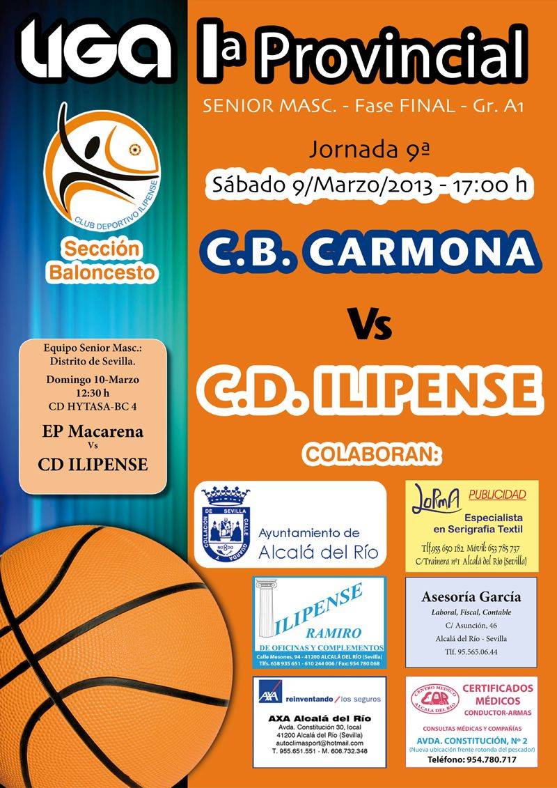 Este sábado, 9 de marzo a las 17.00 h n el Pabellón Municipal de Deportes, novena jornada de baloncesto en la liga 1ª Provincial de la categoría del Sénior Masculino. El CD Ilipense se enfrentará al CB Carmona. El equipo local de baloncesto continúa en su gran gesta en esta liga permaneciendo en los primeros puestos de la tabla clasificatoria.