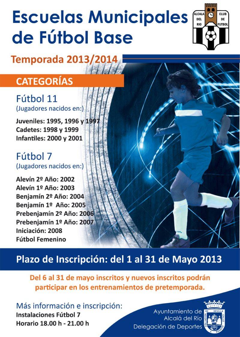 Desde el 1 al 31 de mayo se abre el plazo de inscripción para todos aquellos interesados en participar en la temporada 2013/2014 de las Escuelas Municipales de Fútbol Base. Para ello podrán dirigirse de lunes a viernes en horario de 18.00 h a 21.00 h en las Instalaciones de Fútbol 7.