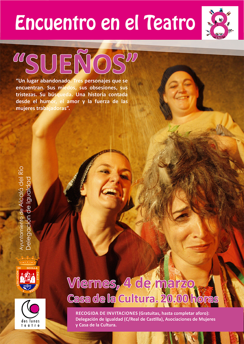 El viernes, 4 de marzo, y dentro del programa de actividades para la semana con motivo del Día Internacional de la Mujer, la Delegación de Igualdad y Asociaciones de Mujeres de Alcalá del Río, San Ignacio, Esquivel y El Viar os invitan al teatro. Con la compañía 'Dos Luna teatro' disfrutaremos de la obra "Sueños" bajo la Dirección y Dramaturgia de David Fernández Troncoso.