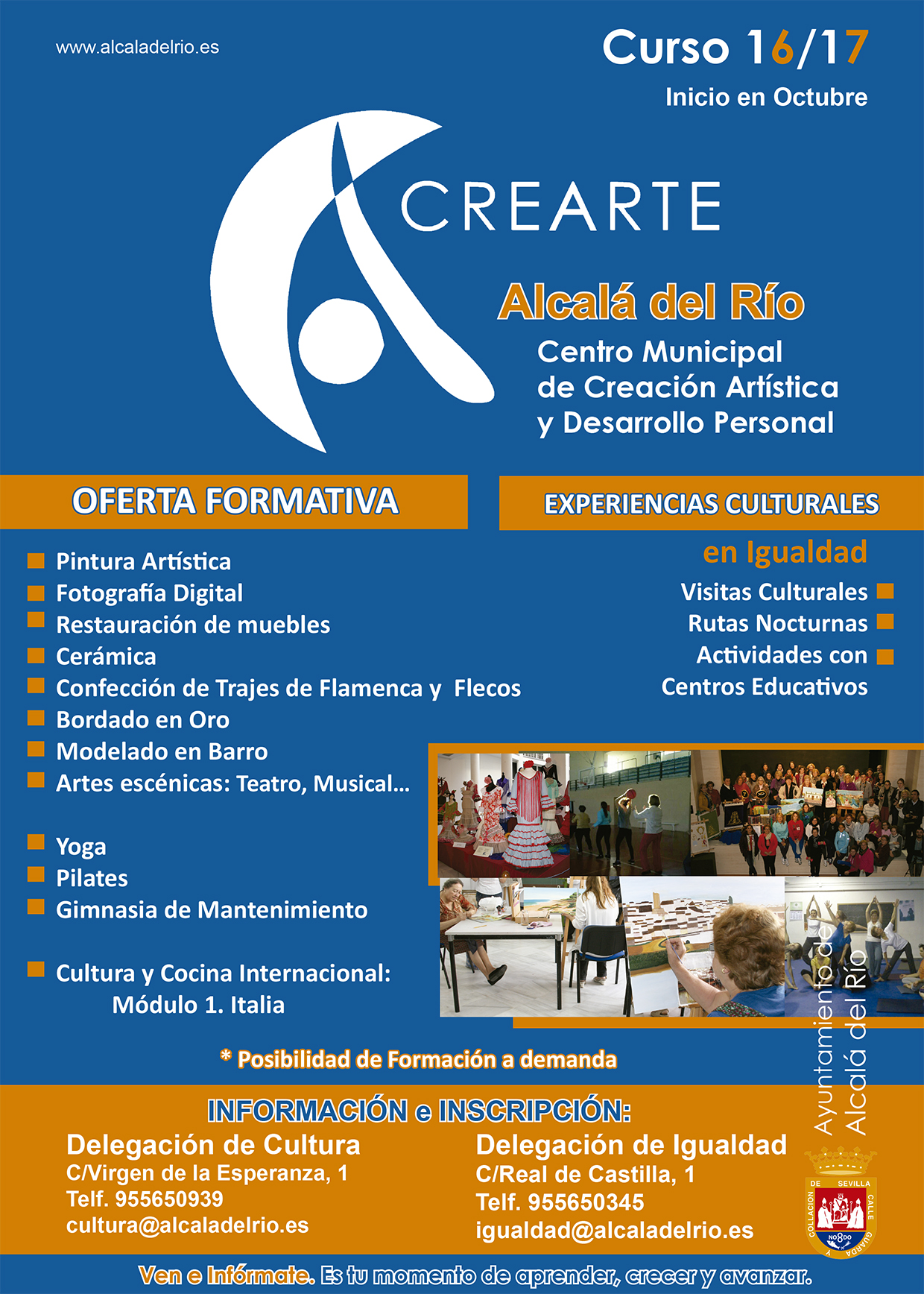 Un nuevo curso donde las Delegaciones de Cultura e Igualdad ponen en marcha el Centro Municipal de Creación Artística y Desarrollo Personal. El Centro CERARTE publica su oferta formativa que mantendrá aproximadamente durante los nueves meses escolares, de octubre 2016 a junio 2017. La gran diversidad de aulas y talleres hace de CREARTE el centro referencia formativo en nuestro municipio.