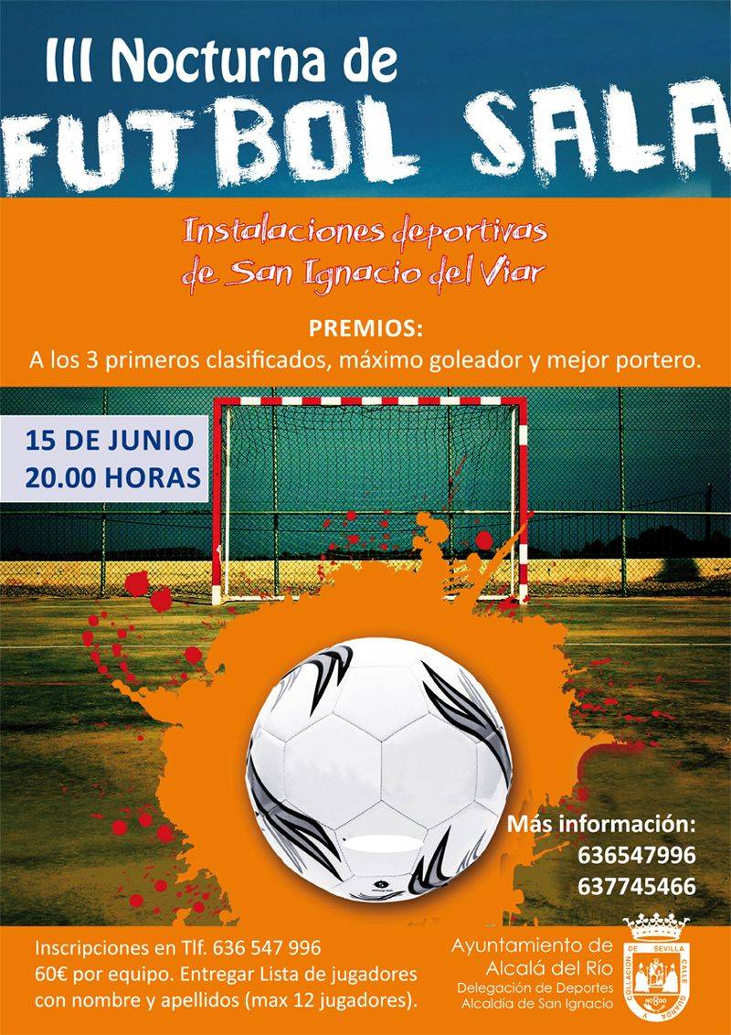 El próximo sábado, 15 de junio, a partir de las 20.00 horas en las instalaciones deportivas de San Ignacio del Viar se celebrará por tercer año consecutivo la III Nocturna de Fútbol Sala para todos los aficionados y amantes de este deporte.