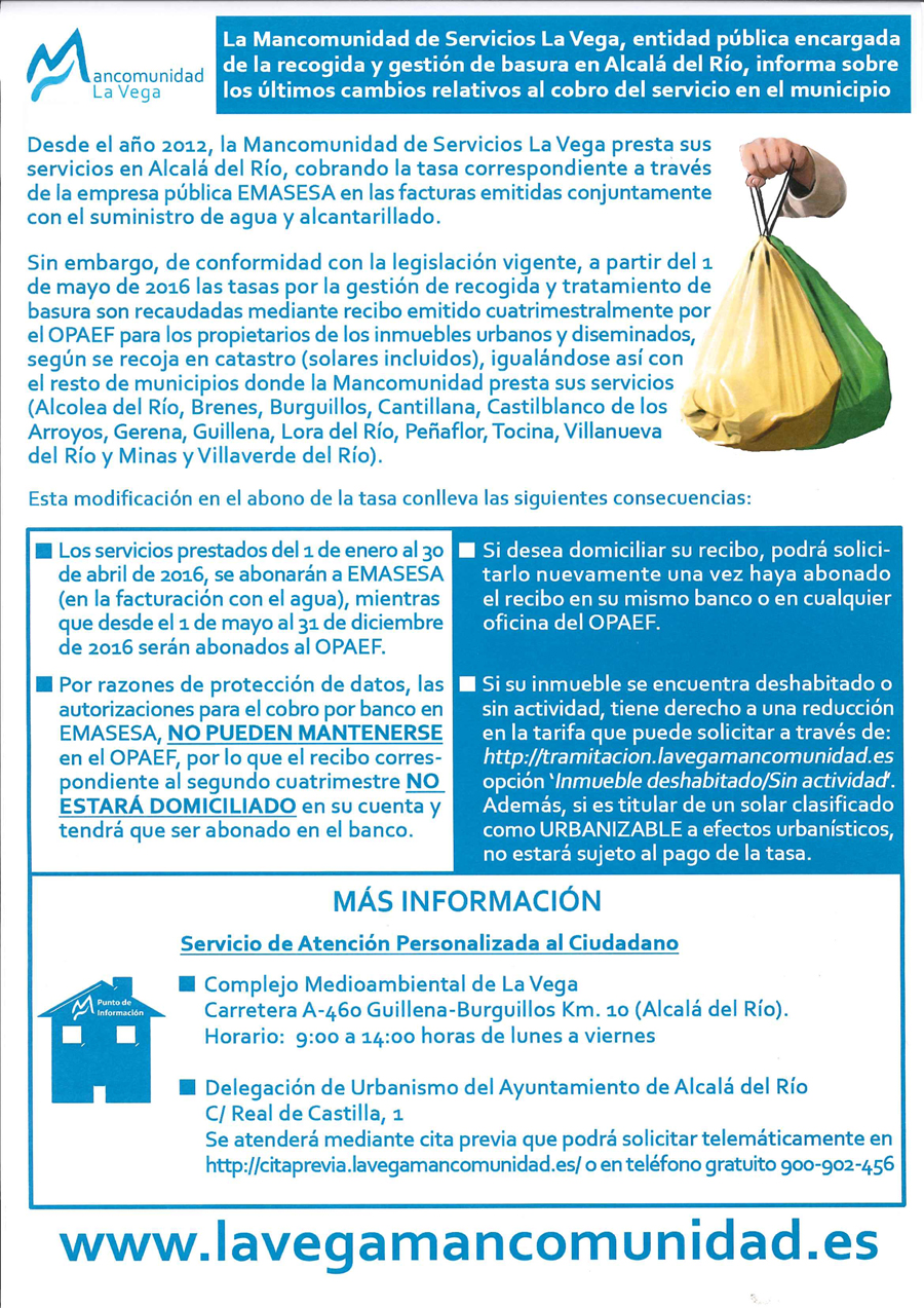 A partir de ahora, de conformidad y en cumplimiento con la legislación vigente desde el 1 de mayo de 2016 las tasas por la gestión de recogida y tratamiento de la basura será recaudada por el OPAEF. Todo ello, no supone modificación de la tasa de la basura, simplemente será gestionada independiente por OPAEF, retirándose del recibo del agua de EMASESA.