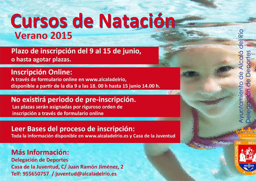 La Delegación de Deportes pone en marcha el proceso de inscripción para los próximos cursos de natación de este verano 2015. Como en ediciones anteriores la inscripción será de forma telemática y cuyo plazo permanecerá abierto el día 9 de junio a las 18.00 horas hasta el lunes 15 de junio a las 14.00 horas.