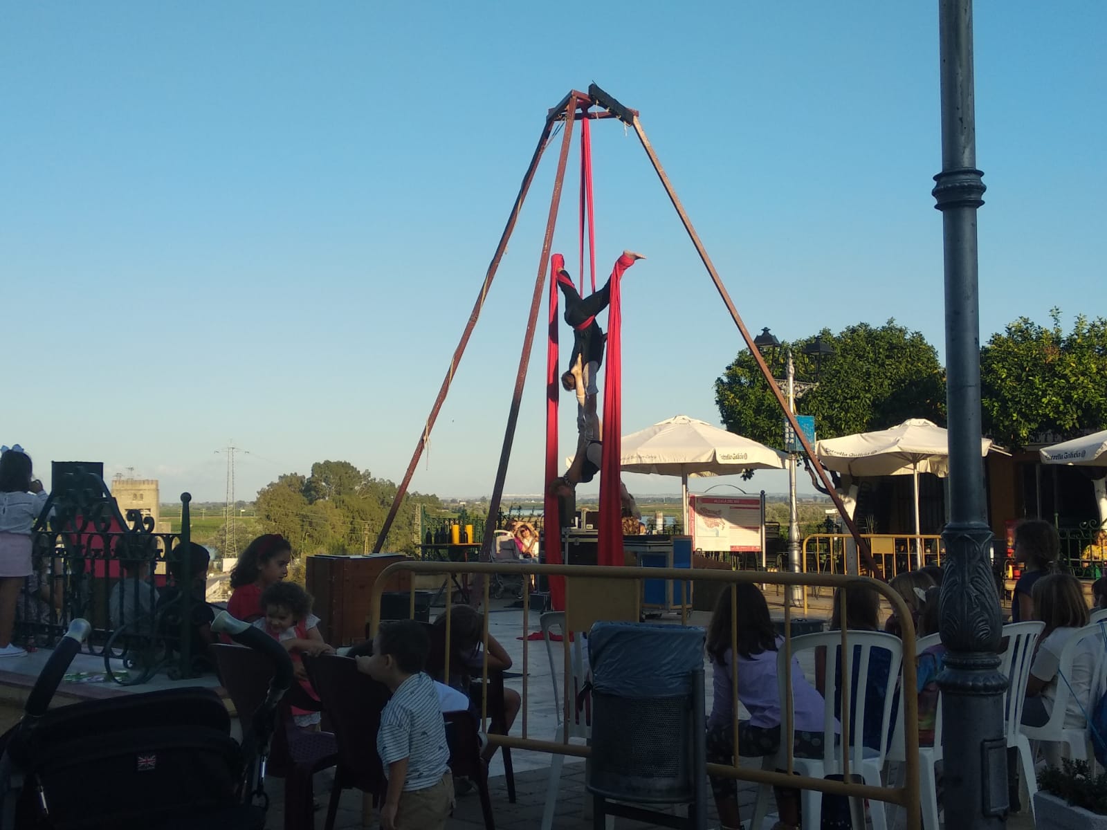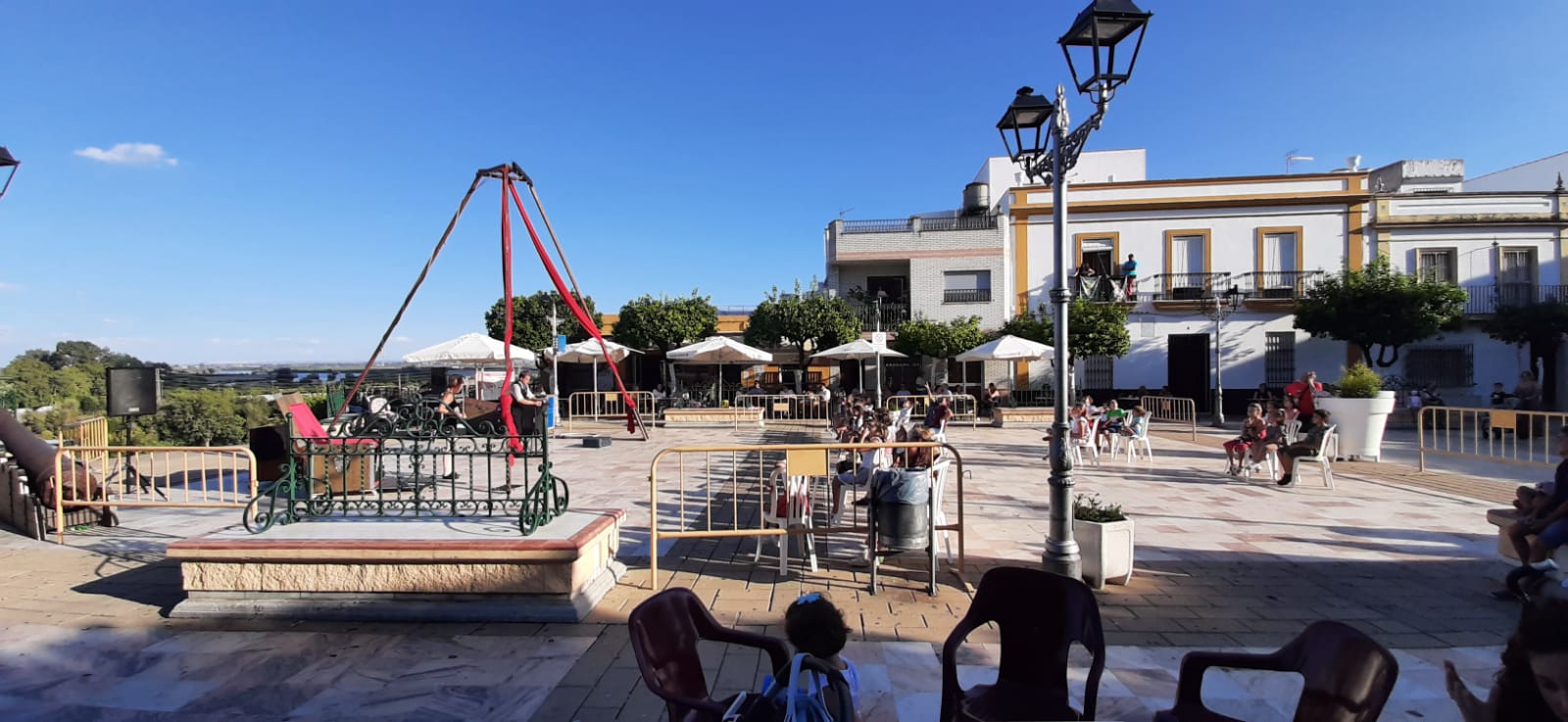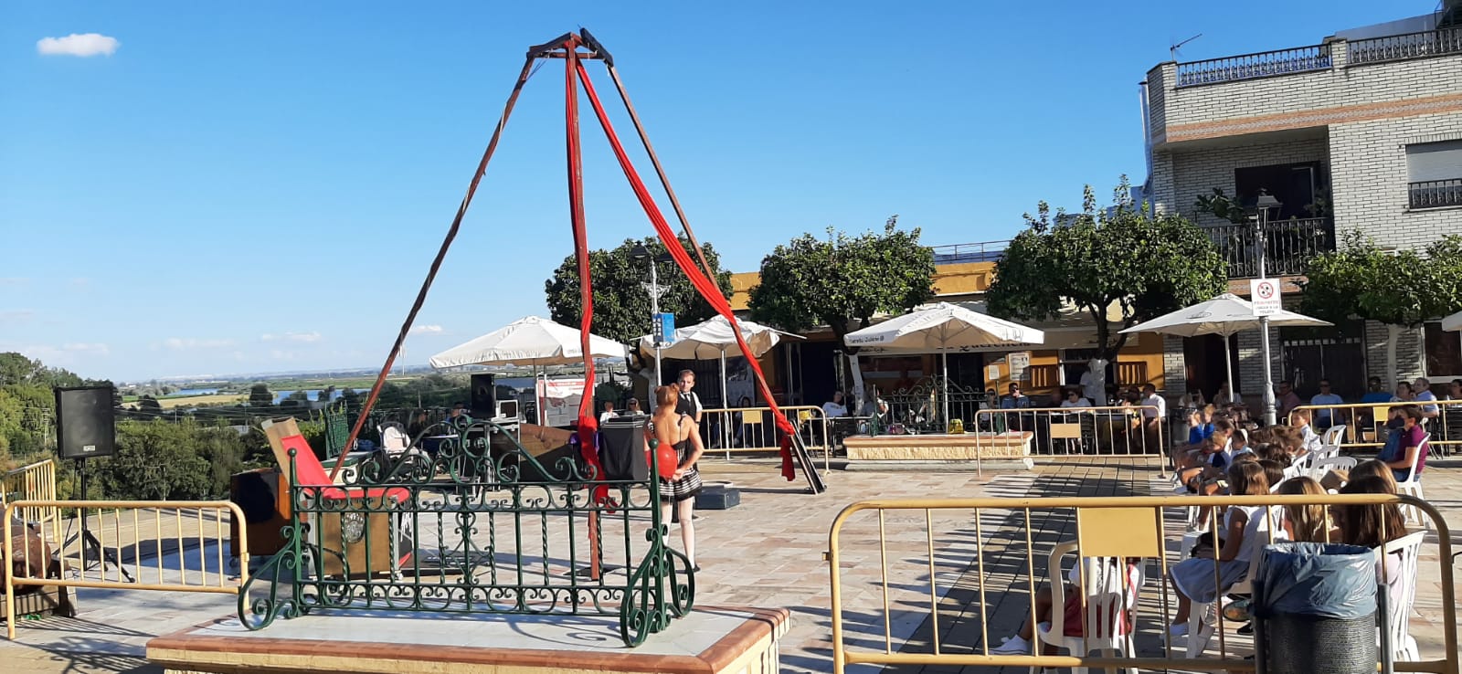 Con mucha diversión y con la ayuda del público que, en ocasiones, participó del espectáculo, los artistas crearon una extraordinaria complicidad y sensacional simbiosis con el público. Un público que disfrutó de este espectáculo de calle que situó a las artes escénicas en uno de los más espectaculares marcos de Alcalá del Río, su Plaza de España.