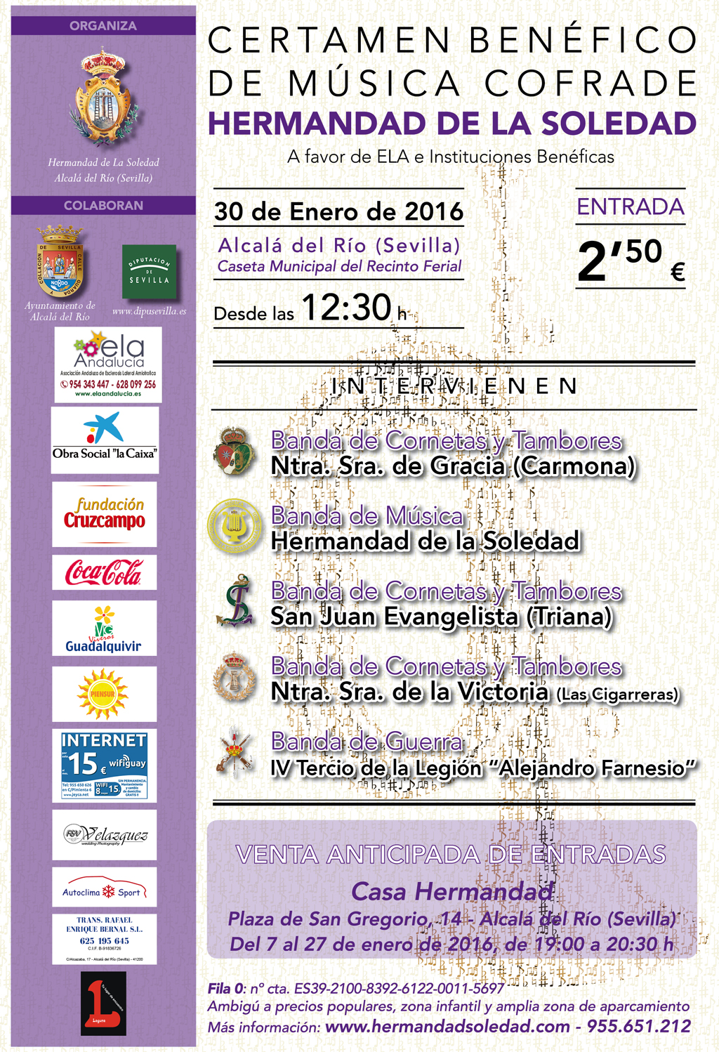 La Hermandad de la Soledad de Alcalá del Río celebrará, el sábado 30 de enero, un Concierto Benéfico de Bandas de Música con la finalidad de obtener fondos a favor de Asociación Andaluza de Esclerosis Lateral Amiotrófica -ELA Andalucía- y otras organizaciones benéficas sin ánimo de lucro.