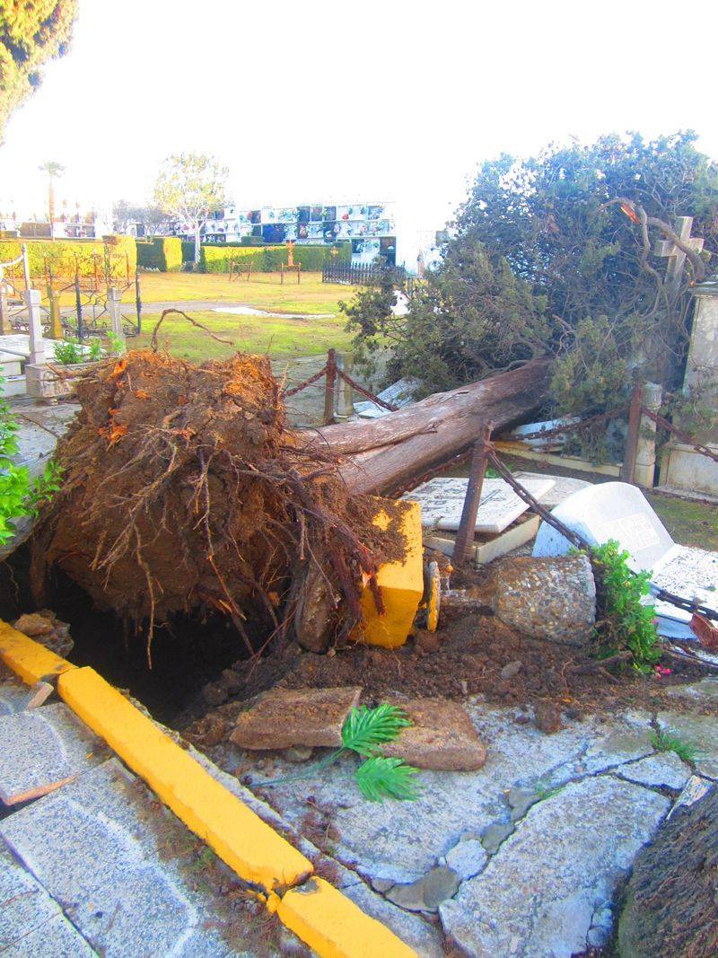 raíces de uno de los longevos cipreses del Cementerio Municipal, además de la caída de diferentes