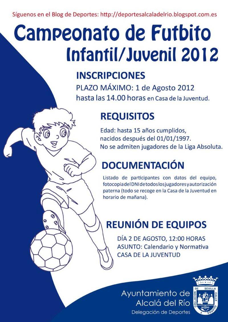 Se encuentra abierto el período de inscripción para los equipos de la Liga de Futbito Infantil-Juvenil Verano 2012. Para cualquier información puedes encontrarla e la Casa de la Juventud y en el blog de deportes de Alcalá del Río, http://deportesalcaladelrio.blogspot.com.es/