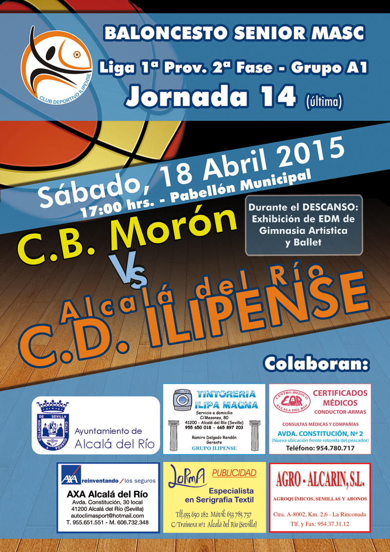 En la tarde del sábado el Equipo sénior de Baloncesto jugará su última jornada de la temporada. A partir de las 17.00 horas en el Pabellón Municipal de Deportes se enfrentará al C.B. Morón en la jornada 14 de la Liga 1ª provincial, 2º Fase-Grupo A1. Acompañemos a los jugadores locales enes cita deportiva, durante el descanso del partido todos los visitantes podrán disfruta de una magnífica Exhibición de las Escuelas Municipales de Deportes de Gimnasia Artística y Ballet. ¡Te esperamos!