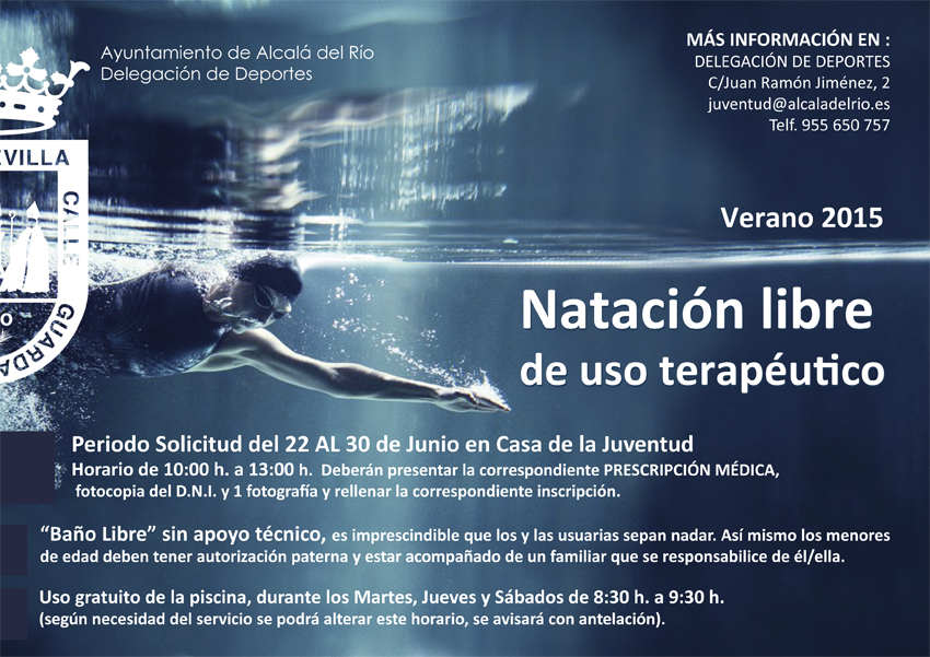 Las personas que por razones terapéuticas deban realizar natación podrán solicitar el uso gratuito de la piscina, durante los Martes, Jueves y Sábados de 8:30 h. a 9:30 h. (según necesidad del servicio se podrá alterar este horario, se avisará conantelación)