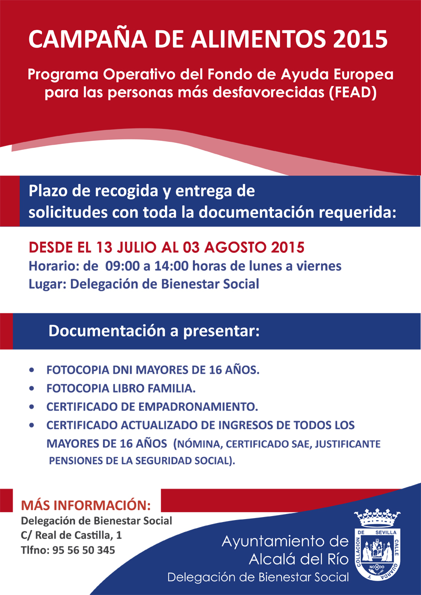 Desde la Delegación de Bienestar Social de Alcalá del Río se abre el procedimiento para solicitar la nueva campaña de alimentos organizada desde el Programa Operativo del Fondo de Ayuda Europea para las personas más desfavorecidas (FEAD).
