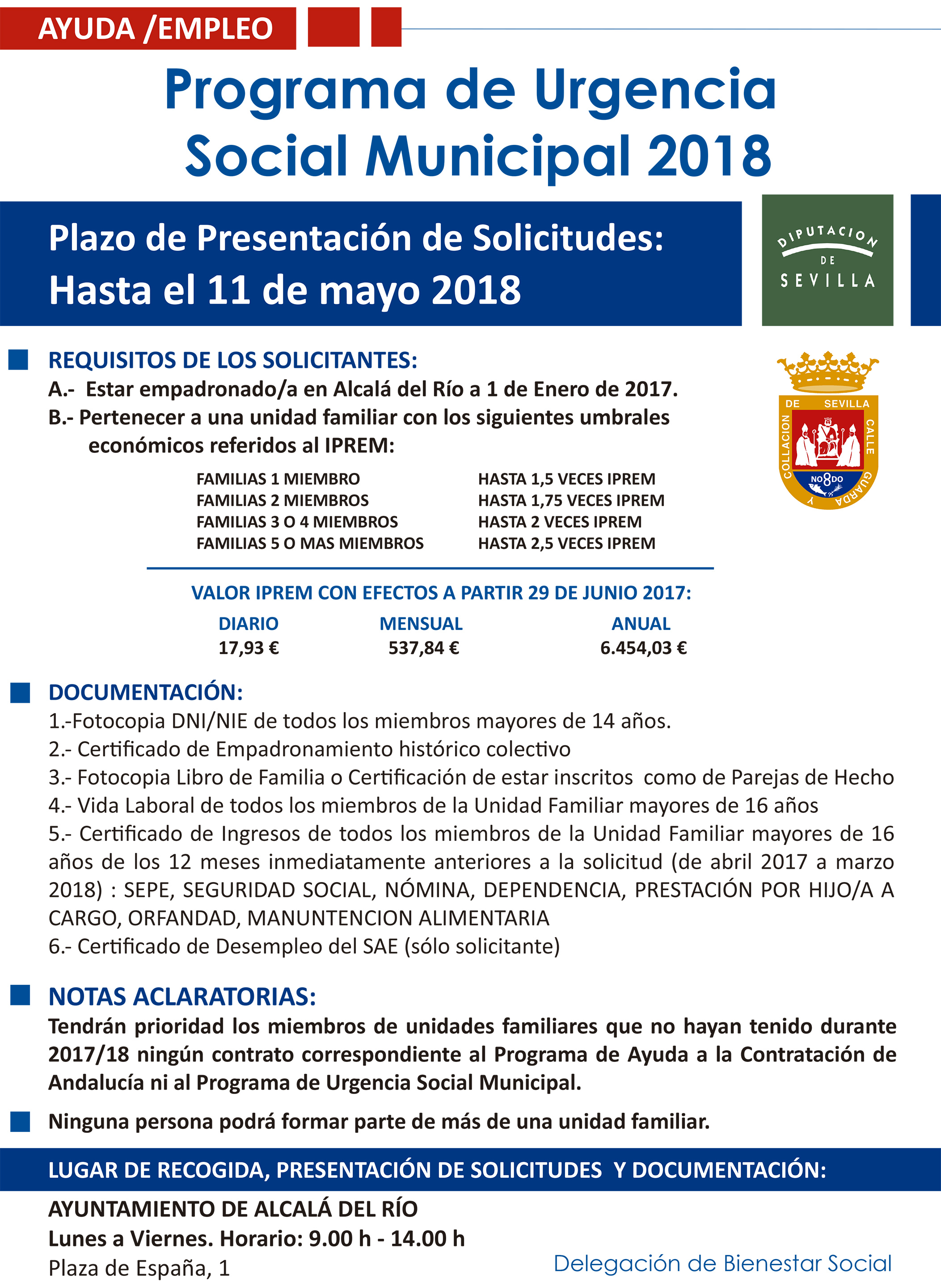 La Delegación de Bienestar Social pone en marcha la presente convocatoria de empleo que tiene por objeto establecer el procedimiento para acogerse a la contratación financiada con cargo al Programa de Urgencia Social Municipal para los municipios y entidades locales autónomas de la provincia de Sevilla 2018 subvencionado al Ayuntamiento de Alcalá del Río de conformidad con lo dispuesto en la Resolución de la Presidencia nº 858/2018, de 1 de marzo.