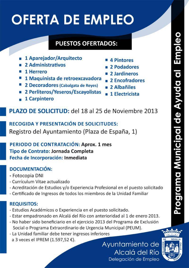 El Ayuntamiento de Alcalá del Río pone en marcha un Programa Municipal de Ayuda al Empleo. Una iniciativa recogida con anterioridad en los Presupuestos 2013.