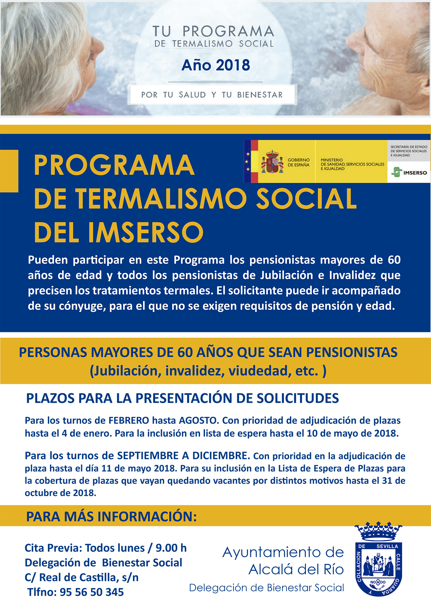 Hasta el próximo 4 de enero la Delegación de Bienestar Social informa que permanece abierto el plazo de presentación de solicitudes para los turnos de enero a mayo 2018. A este programa se encuentra dirigido a mayores de 60 años de edad y todos los pensionistas de Jubilación e Invalidez que precisen los tratamientos termales. El solicitante puede ir acompañado de su cónyuge, para el que no se exigen requisitos de pensión y edad.