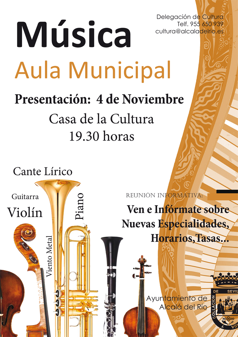 El próximo 4 de noviembre en la Casa de la Cultura a las 19.30 horas, padres, madres, alumnos y/o aquellas personas que quieran adentrarse en la enseñanza musical tiene una cita importante. El Aula Municipal de Música abre un nuevo proyecto para este curso 2015/2016 con nuevas especialidades y programas educativos. Para todo ello, el miércoles celebran una reunión informativa donde darán a conocer la iniciativa, los horarios, tasas, etc.