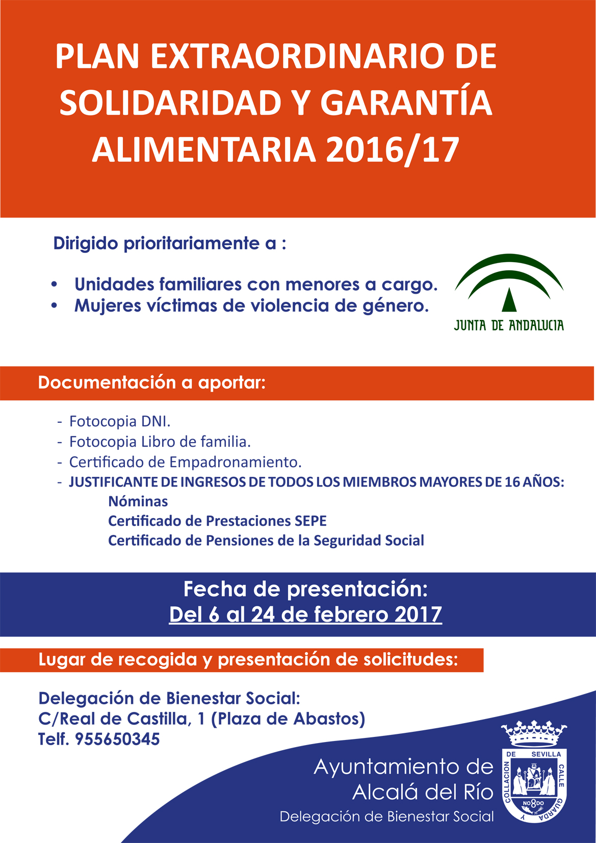 La Delegación de Bienestar Social del Ayuntamiento de Alcalá del Río participa de nuevo este año en el Programa de Garantía Alimentaria, promovido por la Consejería de Administración Local y Relaciones Institucionales de la Junta de Andalucía. El objetivo de este plan es garantizar las necesidades básicas de personas y familias en situación de exclusión social o riesgo de estarlo. Este programa ofrece ayudas puntuales personas o familias para la atención de sus necesidades básicas cuando carecen de recursos económicos mínimos para ello, siendo necesario cumplir una serie de requisitos para poder acceder.