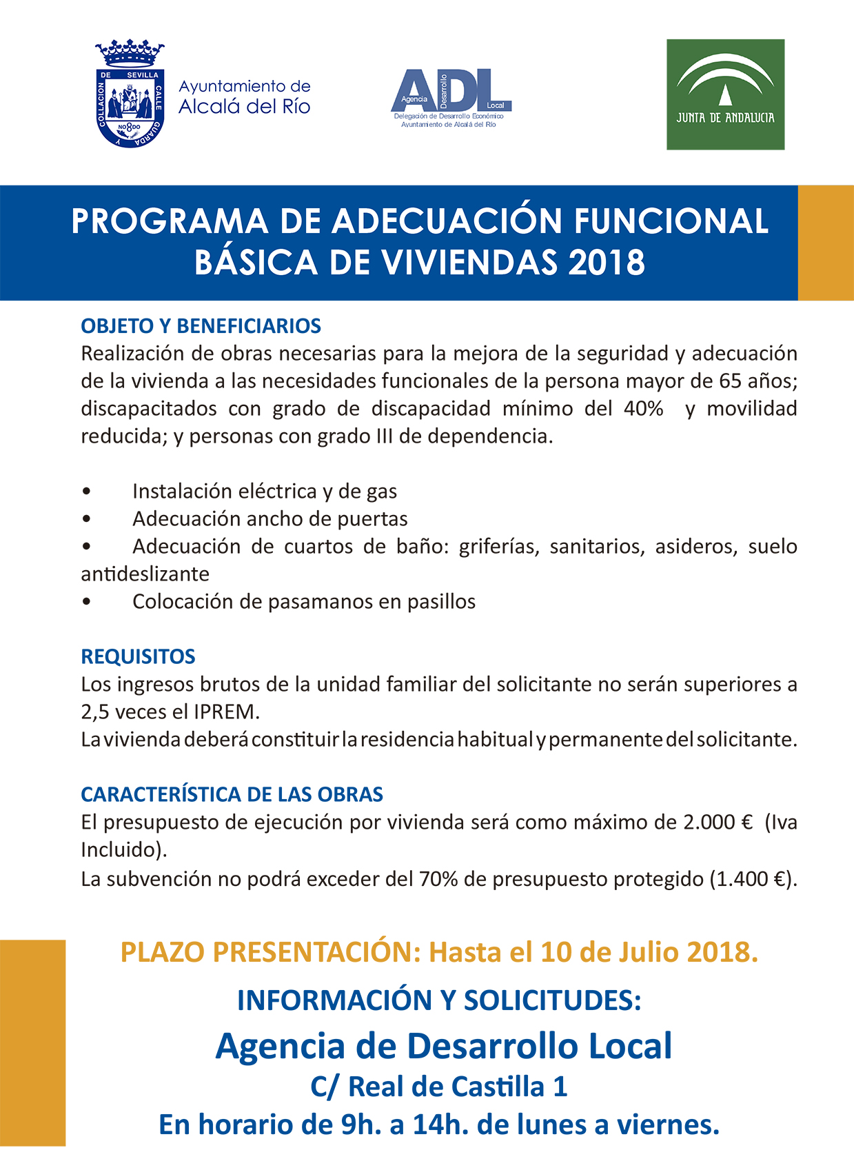 Se trata de un programa de ayudas dirigido a personas mayores de sesenta y cinco años o personas con discapacidad y movilidad reducida o grandes dependientes que necesiten adaptar su vivienda habitual a sus necesidades especiales. La Agencia de Desarrollo Local recuerda para todos aquellos interesados y dentro de los requisitos estipulados por la consejería que el plazo para la presentación de solicitudes permanecerá abierto hasta el próximo 10 de julio.