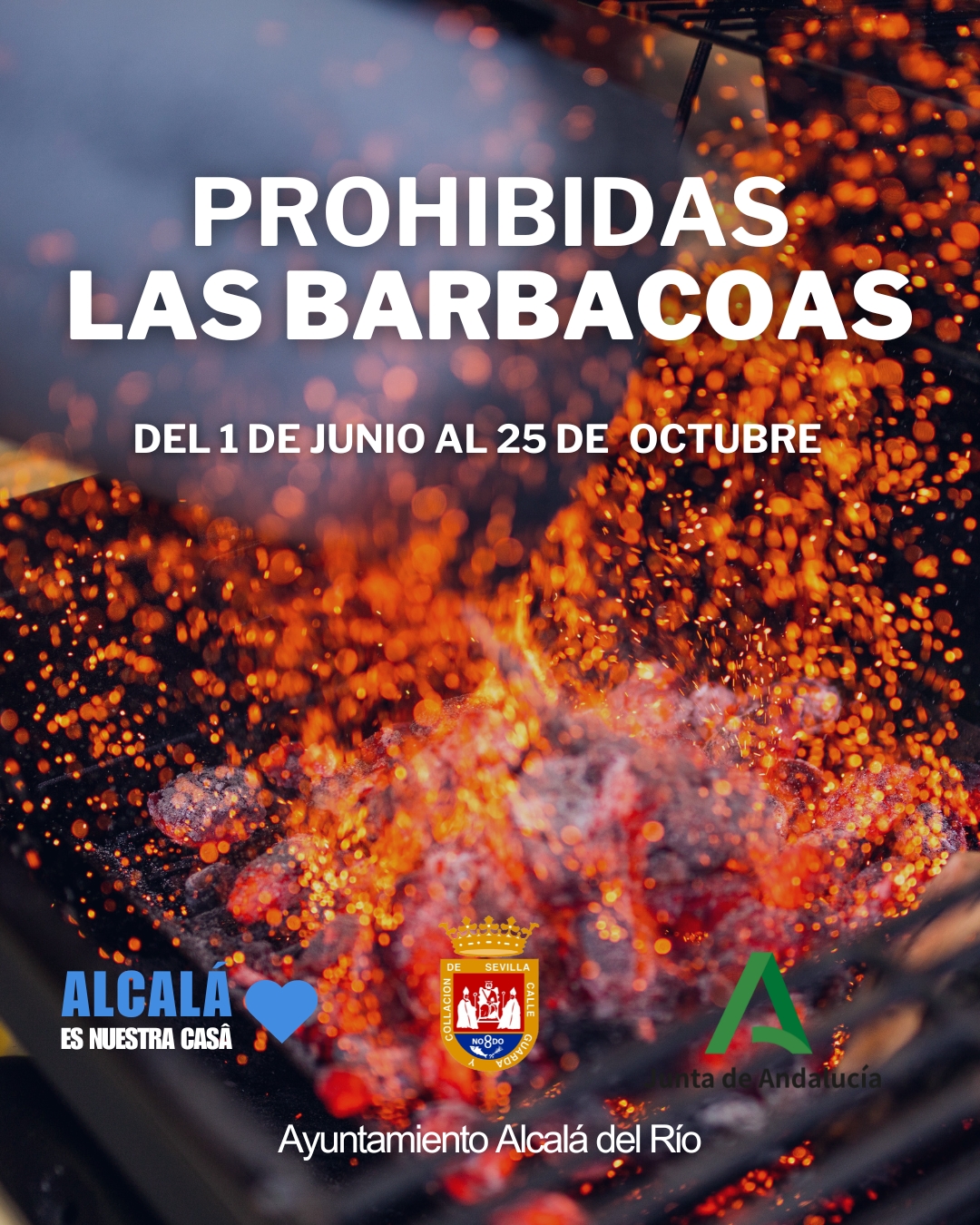 La Delegación de Medio Ambiente del Ayuntamiento de Alcalá del Río informa a toda la ciudadanía que, desde el 1 de junio hasta el 15 de octubre, queda terminantemente prohibido encender barbacoas en todos los espacios públicos municipales, en cumplimiento de la normativa vigente de la Junta de Andalucía para la prevención de incendios forestales.