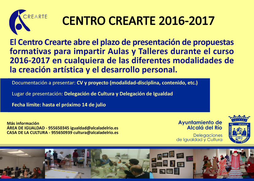 El Centro Municipal CREARTE informa para todos aquellos interesados que abre el plazo para recoger propuestas formativas para impartir Aulas y Talleres durante el curso 2016/2017 en cualquier de las diferentes modalidades de la creación artística y el desarrollo personal. Este centro municipal ofrece cada año la mayor oferta de aulas de formación en diferentes disciplinas artísticas y para el desarrollo personal como yoga, gimnasia, cerámica, confección, fotografía, etc.