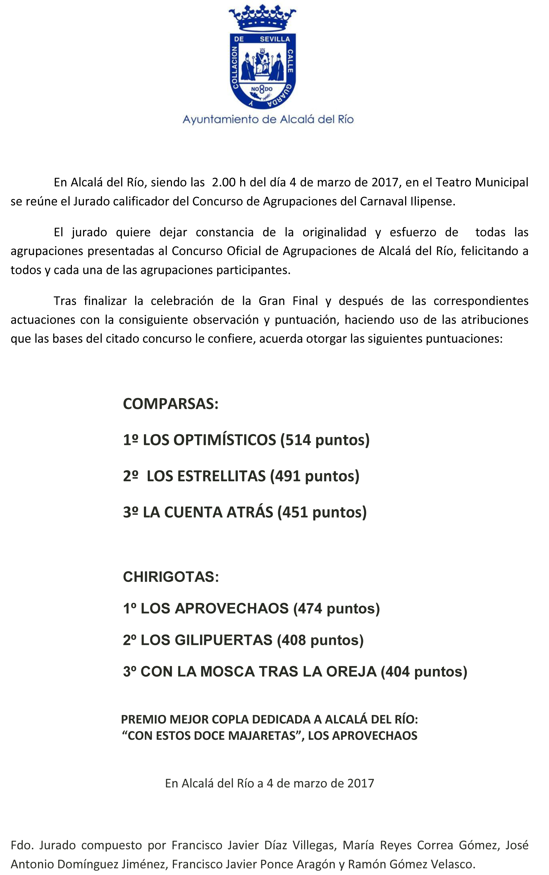 Resultado de la Gran Final del Concurso de Agrupaciones del Carnaval 2017 de Alcalá del Río