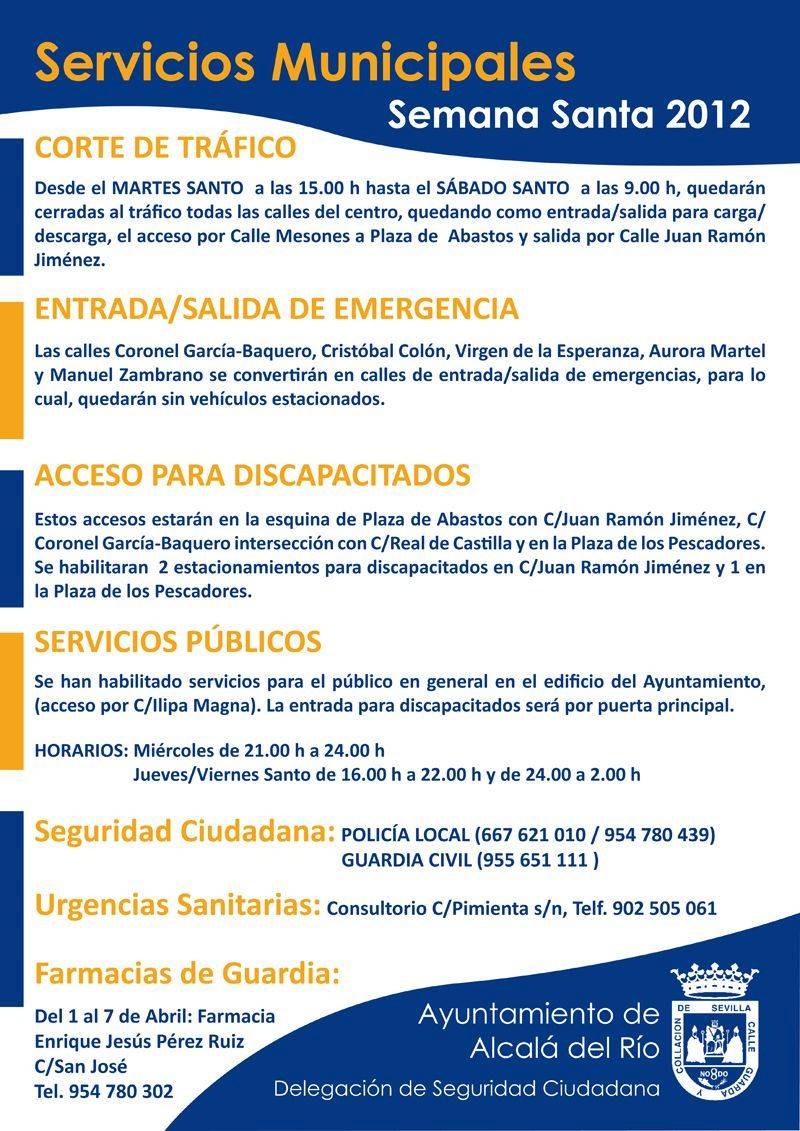 Se informa a todos los vecinos de Alcalá del Río los servicios municipales que se mantendrán durante estos días de Semana Santa 2012. Desde la Delegación de Seguridad Ciudadana se ruega la mayor colaboración para que estos días de la semana grande discurran con total normalidad y el esplendor que se merecen. Además se reiteran las disculpas por las molestias ocasionadas.