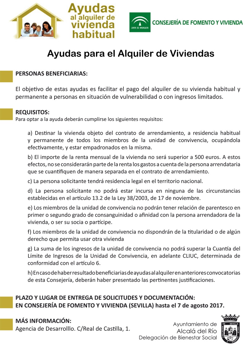 Desde la Agencia de Desarrollo y Delegación de Bienestar Social vuelven a informar que hasta el próximo 7 de Agosto se encunra abierto el plazo para solicitar la Ayuda al Alquiler de la Junta de Andalucía mediante la cual los beneficiarios contarán con una aportación del 40% de la renta del alquiler.