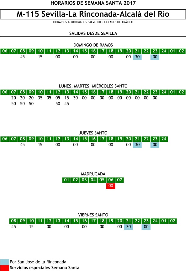 La Gerencia del Consorcio Metropolitano de Transportes informa de los servicios especiales concertados con los operadores para Alcalá del Río con vistas a la Semana Santa 2017.