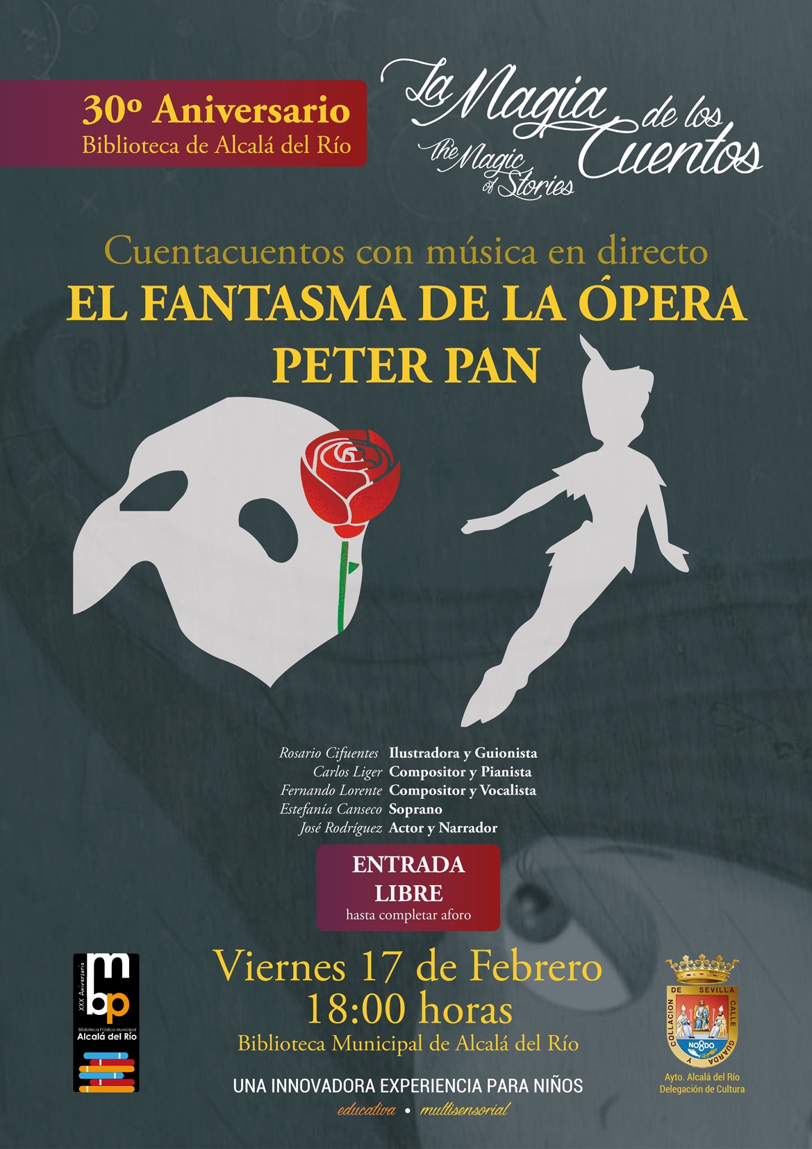 En el marco de las actividades para conmemorar el XXX aniversario de la Biblioteca Pública Municipal, la Delegación de Cultura organiza un espectáculo de cuentacuentos con música en directo. El próximo VIERNES 17 DE FEBRERO A LA 18.00 h. EN LA CASA DE LA CULTURA DE ALCALÁ DEL RÍO podremos disfrutar de El Fantasma de la Ópera y Peter Pan con La Magia de los Cuentos.
