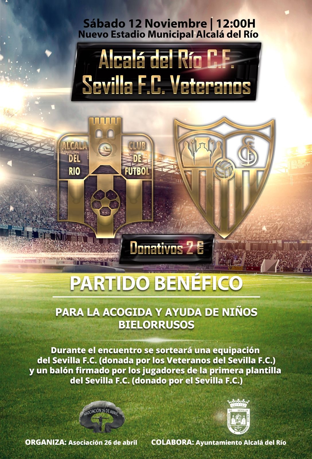 El próximo sábado 12 de noviembre la Delegación de Deportes ofrece sus instalaciones para unir deporte y solidaridad. Un partido benéfico para la acogida y ayuda de niños bielorrusos que cuenta con la organización de la Asociación local 26 de abril y desinteresada colaboración de Alcalá del Río C.F. y Sevilla F.C. Veteranos que hacen posible este encuentro.