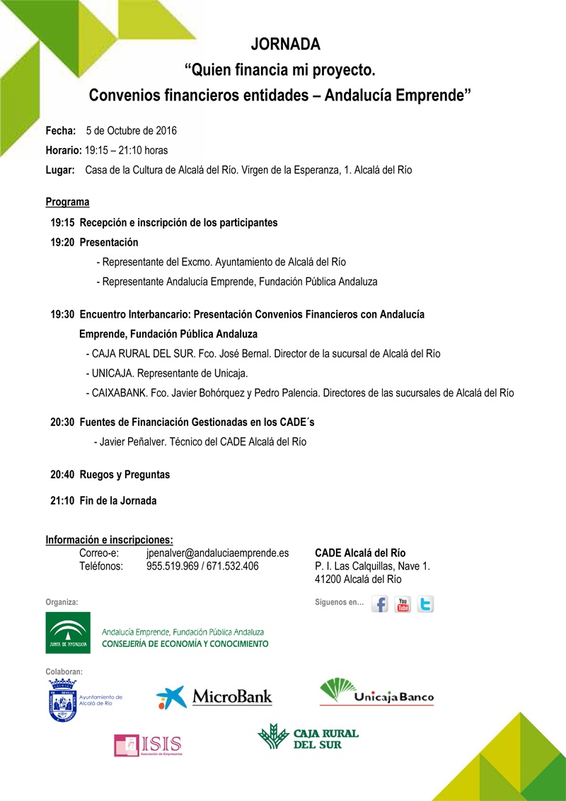 Recordamos la invitación a todos aquellos interesados que nos hace el CADE de Alcalá del Río a la jornada que organiza bajo el título "Quien financia mi proyecto. Convenios financieros entidades ? Andalucía Emprende" prevista para el miércoles, 5 de Octubre de 2016 a las 19:15 horas, en la Casa de la Cultura de Alcalá del Río.
