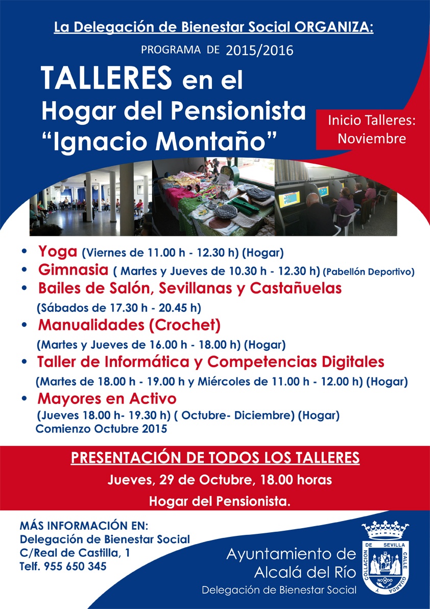 De nuevo un año más se ponen en marcha una amplia oferta de talleres para mayores desde el Hogar del Pensionista ?Ignacio Montaño?. Se trata de un programa hecho a medida que incluye sugerencias, necesidades y peticiones realizadas por los propios mayores. Una programación que ofrece la oportunidad de trabajar y mejorar sobre áreas como el desarrollo personal, estado físico, nueva competencias digitales y nuevas tecnologías, creatividad y entretenimiento, entre otras.