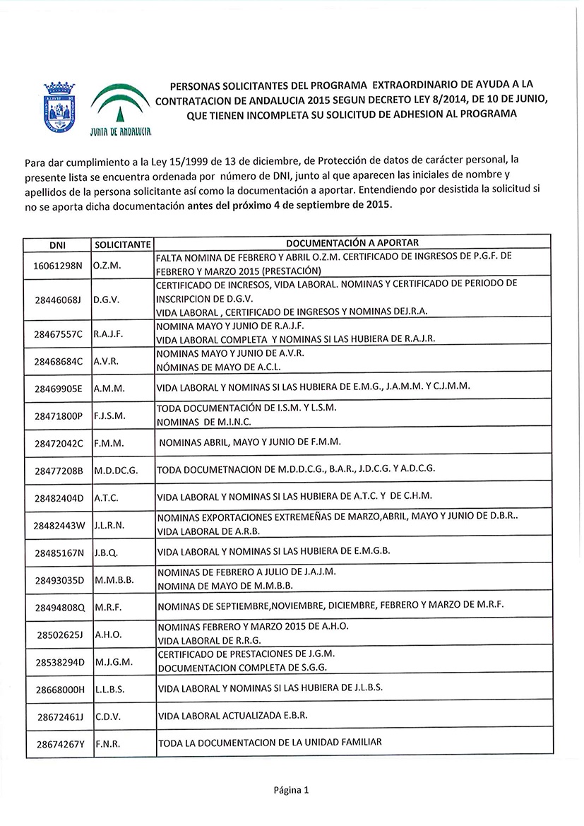 Cumpliendo con la normativa del proceso de selección del Programa de Ayuda de la Contratación, y una vez revisadas todas las solicitudes presentadas, se abre un periodo de subsanación para todos aquellos solicitantes que no han hecho entrega de toda la documentación necesaria teniendo hasta el 4 de septiembre para poder remitirla al registro del Ayuntamiento de Alcalá del Río.