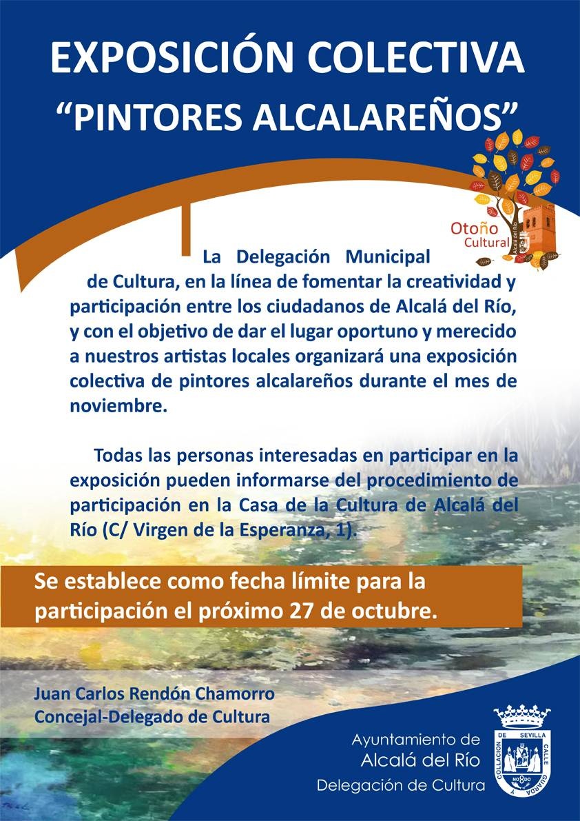 La Delegación Municipal de Cultura, en la línea de fomentar la creatividad y participación entre los ciudadanos de Alcalá del Río, y con el objetivo de dar el lugar oportuno y merecido a nuestros artistas locales organizará una exposición colectiva de pintores alcalareños durante el mes de noviembre.