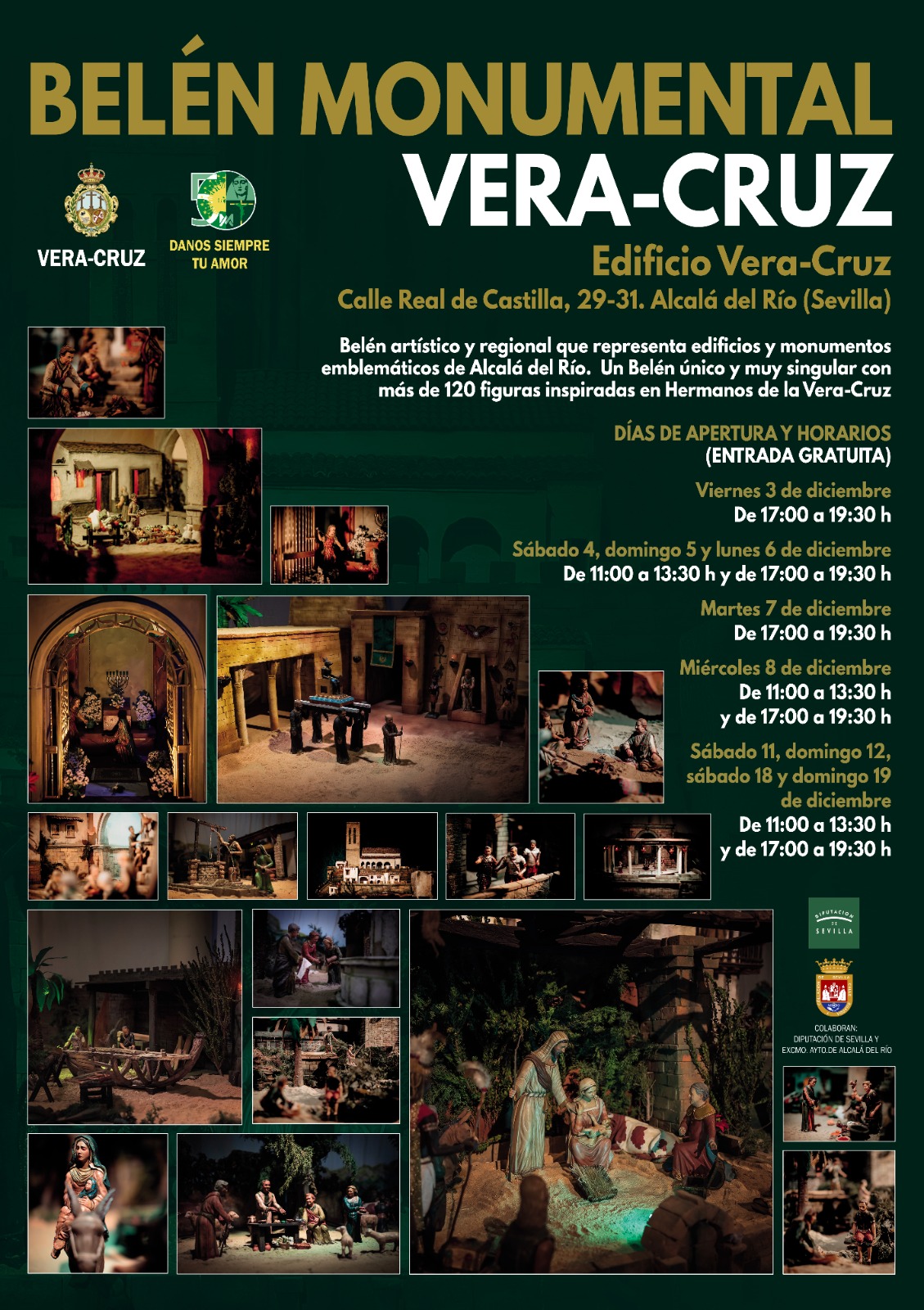 El Belén puede visitarse en el Edificio Vera Cruz. Casa Hermandad de la calle Real de Castilla - Viernes 3 de diciembre, de 17:00 a 19:30 horas. - Sábado 4, domingo 5, lunes 6 de 11:00 a 13:30 horas y de 17:00 a 19:30 horas. - Martes 7 de diciembre, de 17:00 a 19:30 horas. - Miércoles 8 de diciembre, de 11:00 a 13:30 horas y de 17:00 a 19:30 horas. - Sábado 11, domingo 12; sábado 18 y domingo 19 de diciembre de 11:00 a 13:30 horas y de 17:00 a 19:30 horas.