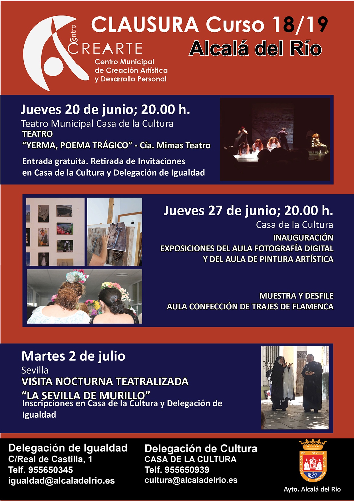 Diferentes actividades pondrán el broche de oro a las diferentes aulas formativas del Centro Municipal de Creación Artística y Desarrollo Personal 2018/19. Un centro que ya se ha convertido en referencia y que cada año pone a disposición de una amplia oferta de disciplinas como fotografía, pintura, confección de trajes de flamenca, yoga, gimnasia, etc. Todo ello enriquecido más si cabe, por las numerosas actividades culturales complementarias como las visitas culturales y teatro, entre otros.
