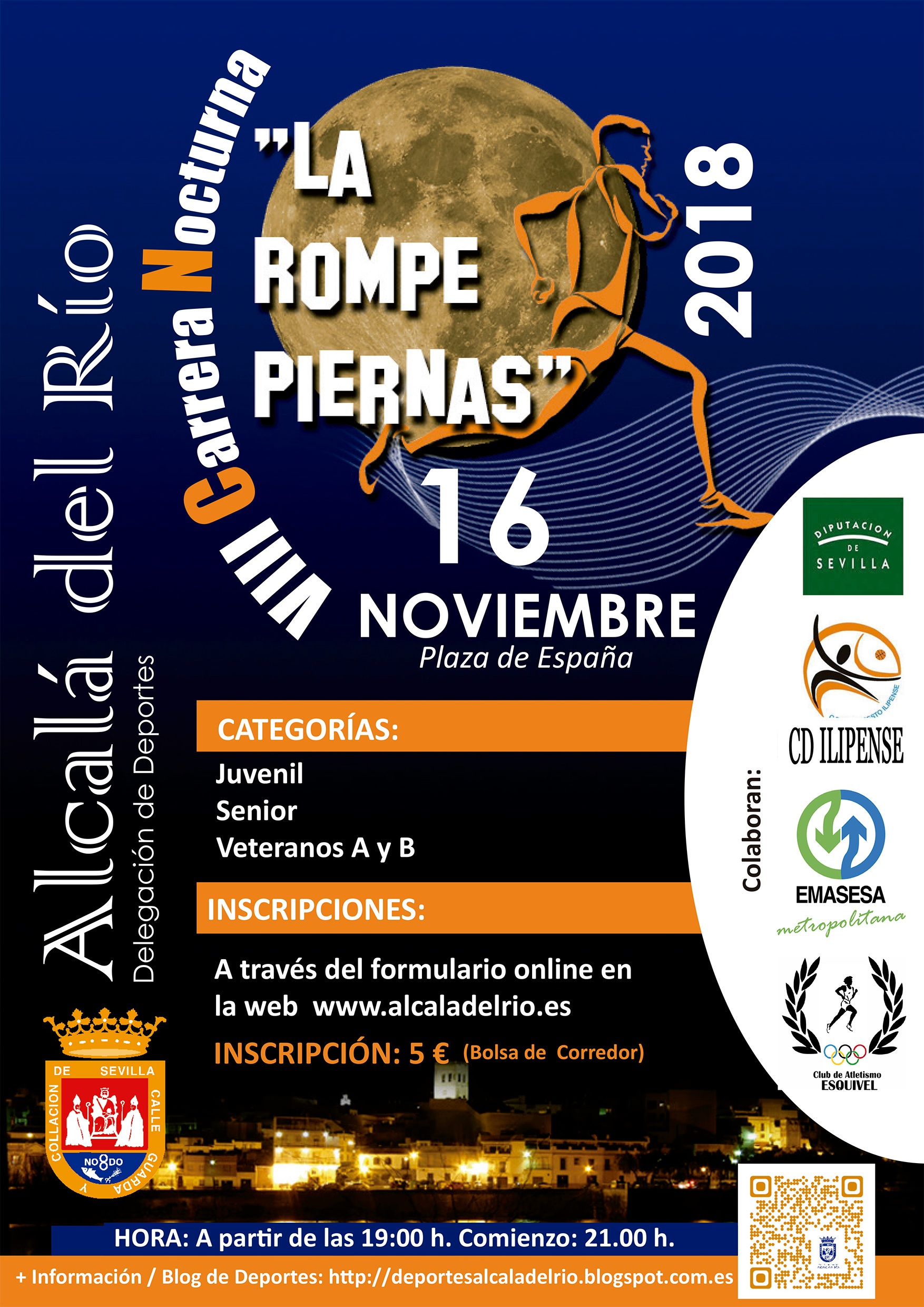 La Delegación de Deportes del Excmo. Ayuntamiento de Alcalá del Río, con la gestión del CD ILIPENSE y el CD Atletismo ESQUIVEL y la colaboración de Emasesa y Diputación de Sevilla, organiza y celebra el próximo 16 de noviembre de 2018 la ?VIII Carrera Nocturna LA ROMPEPIERNAS Alcalá del Río 2018.