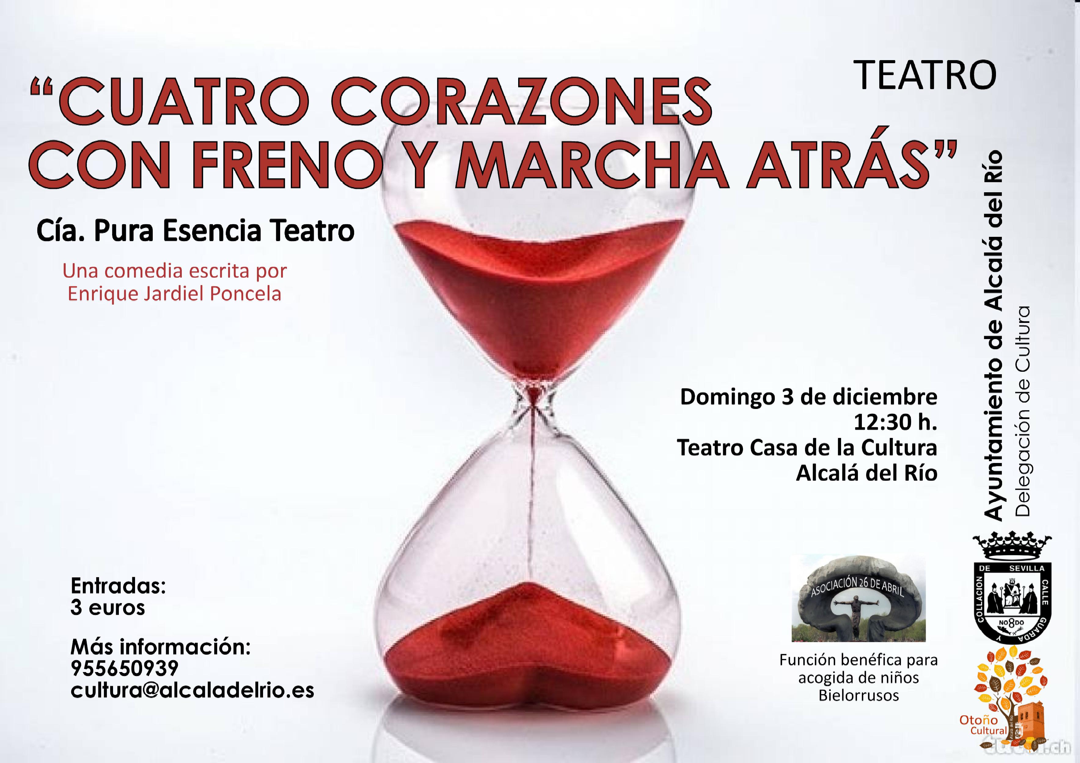 Este domingo 3 de diciembre, a las 12.30 h., en el Teatro de la Casa de la Cultura de Alcalá del Río, y con carácter benéfico para ayudar a la acogida de niños bielorrusos a cargo de la ?Asociación 26 de abril?, tendrá lugar la representación teatral de la comedia "Cuatro corazones con freno y marcha atrás" (Inicialmente titulada "Morirse es un error") de Enrique Jardiel Poncela por parte de la Cía. Pura Esencia Teatro.